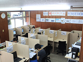仕切りのある個別ブースは自由席!お気に入りのブースで自習スタイルで課題を進めます。